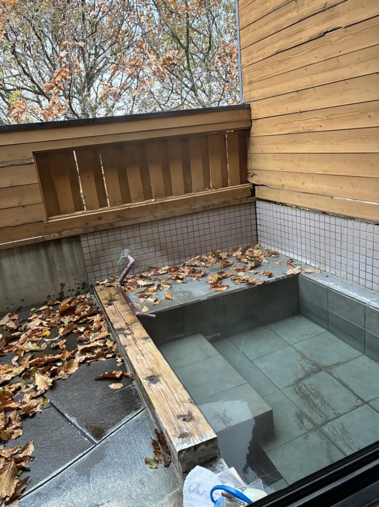 各部屋に露天風呂がついている。枯れ葉の掃除から始めた。おもしろい。